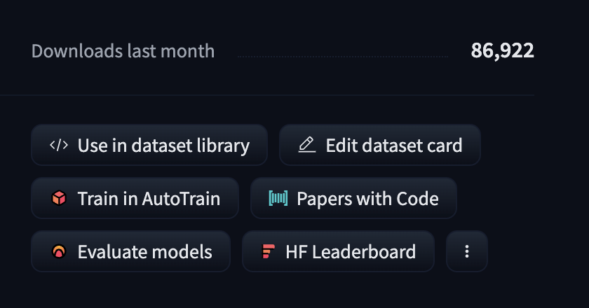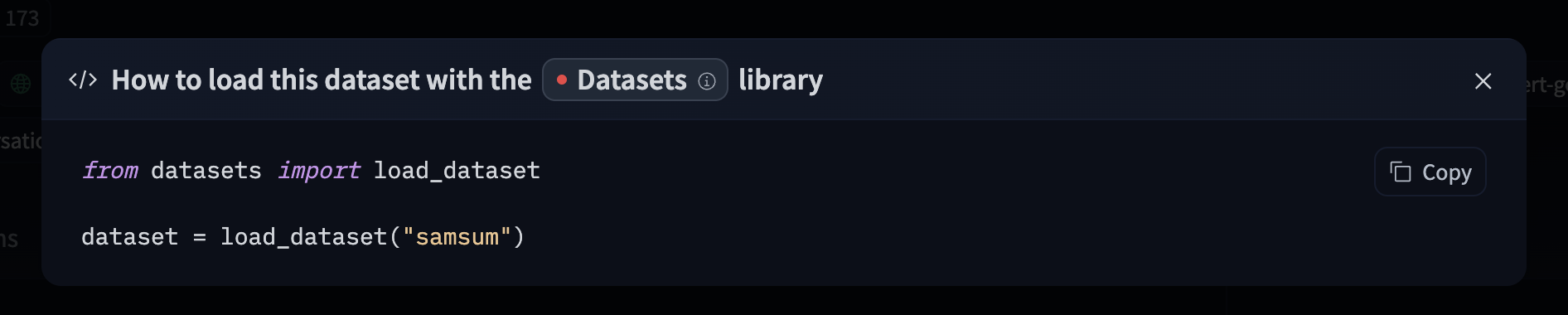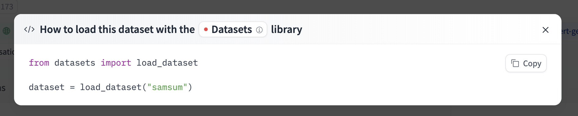 If a dataset on the Hub is tied to a supported library, loading the dataset can be done in just a few lines. For information on accessing the dataset, you can click on the “Use this dataset” button on the dataset page to see how to do so. For example, samsum