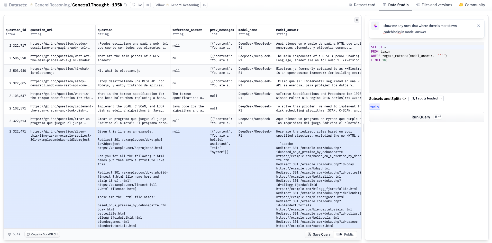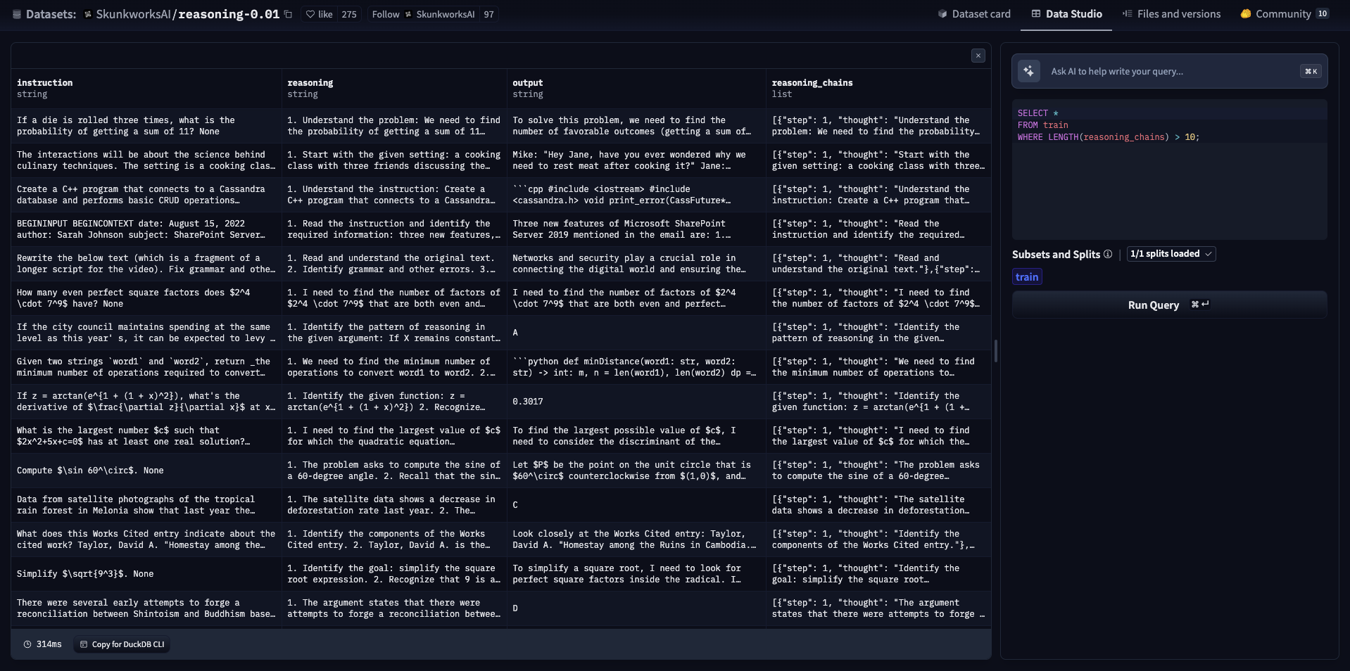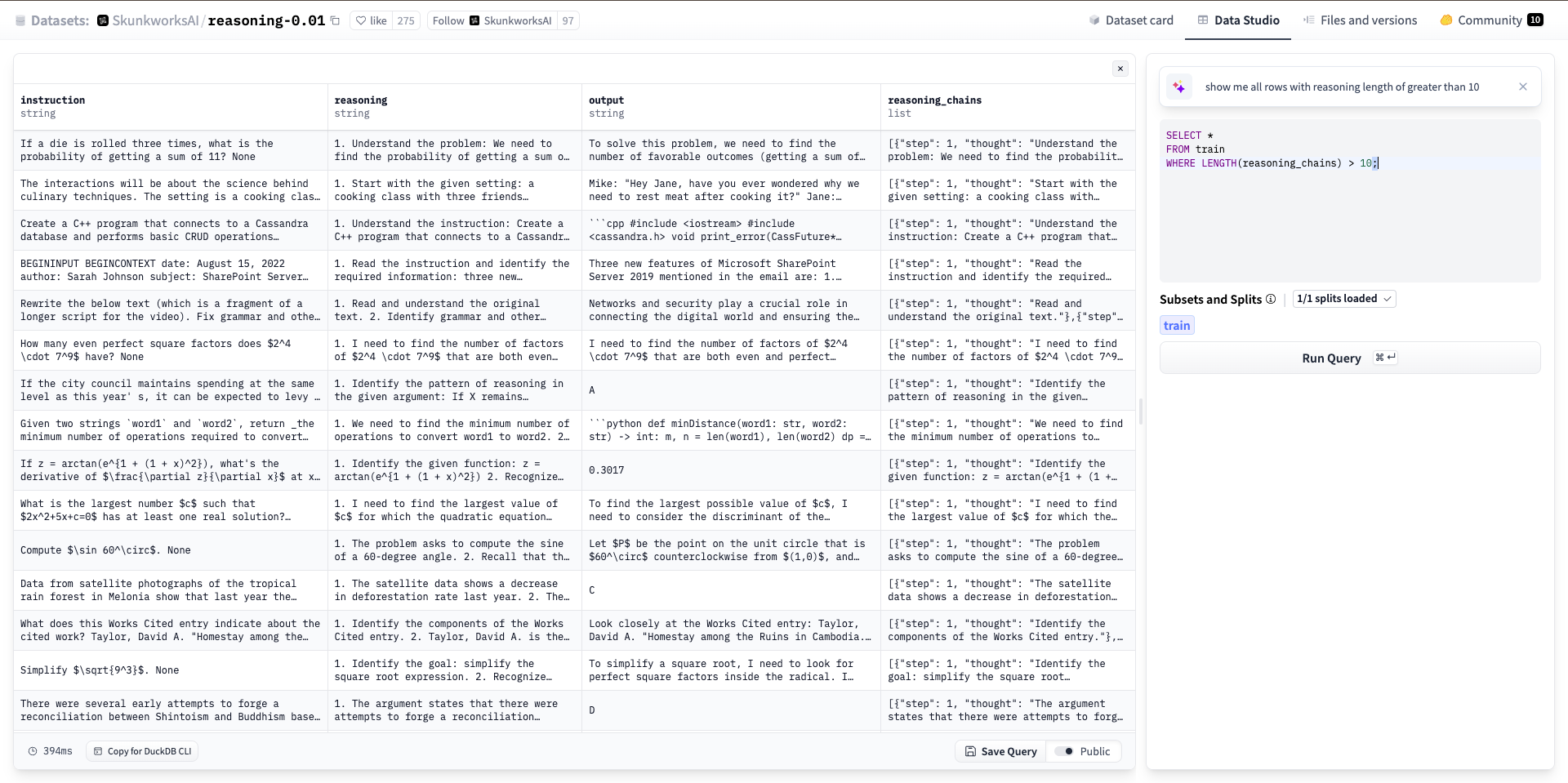 The SQL Console makes filtering datasets really easy. For example, if you want to filter the SkunkworksAI/reasoning-0.01