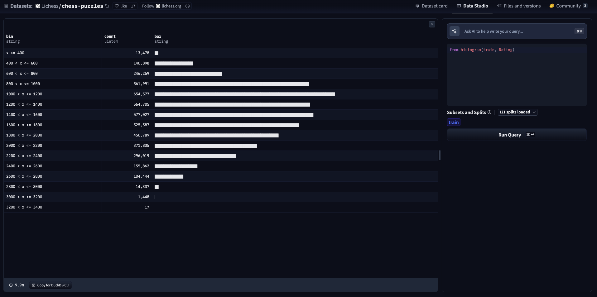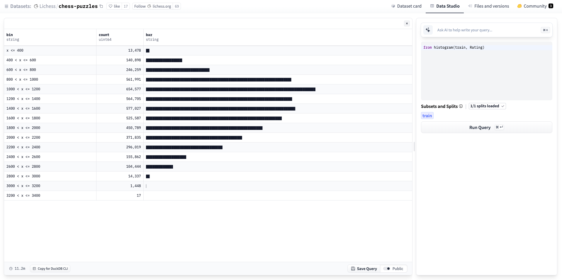 Many dataset authors choose to include statistics about the distribution of the data in the dataset. Using the DuckDB histogram