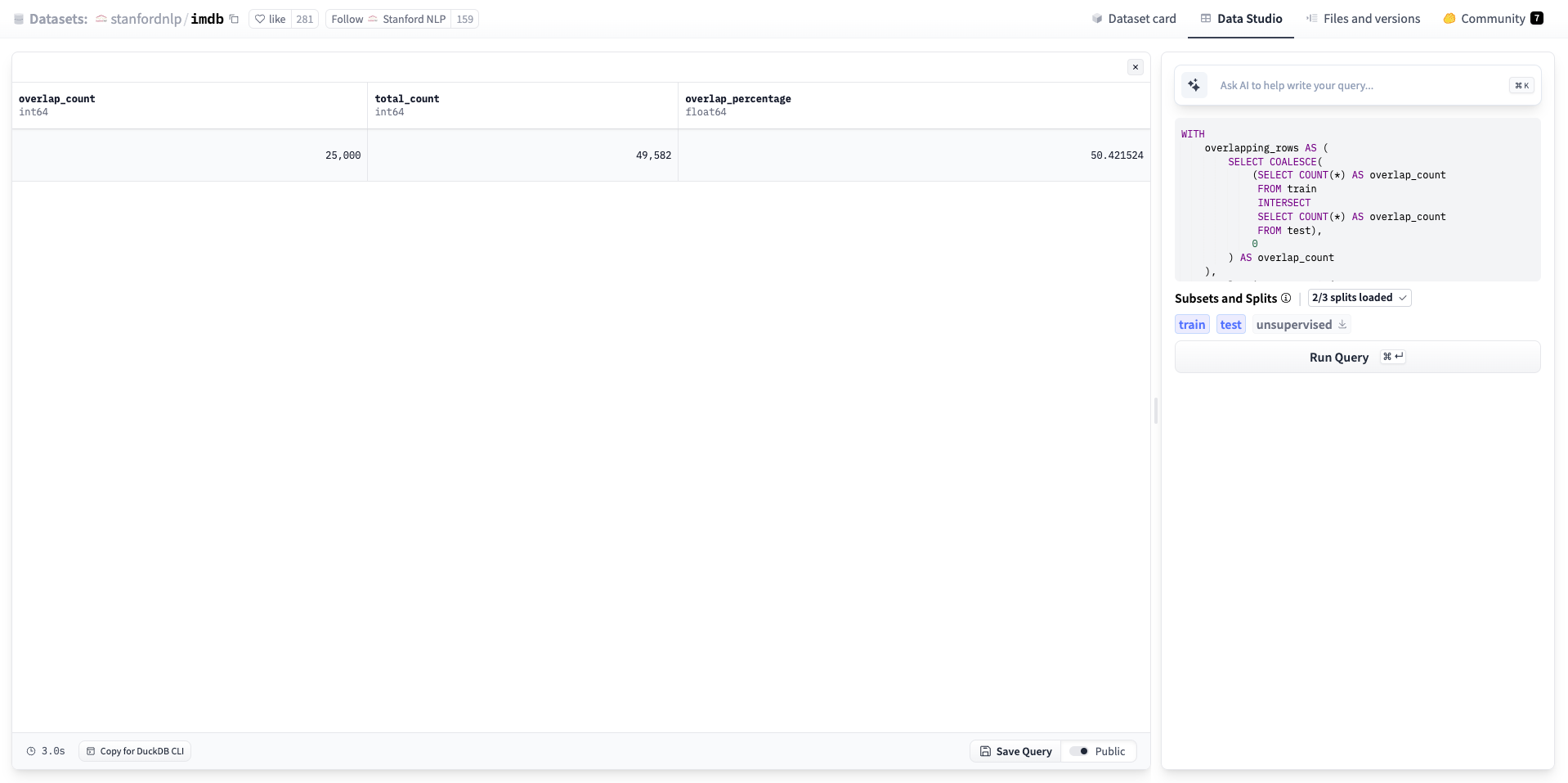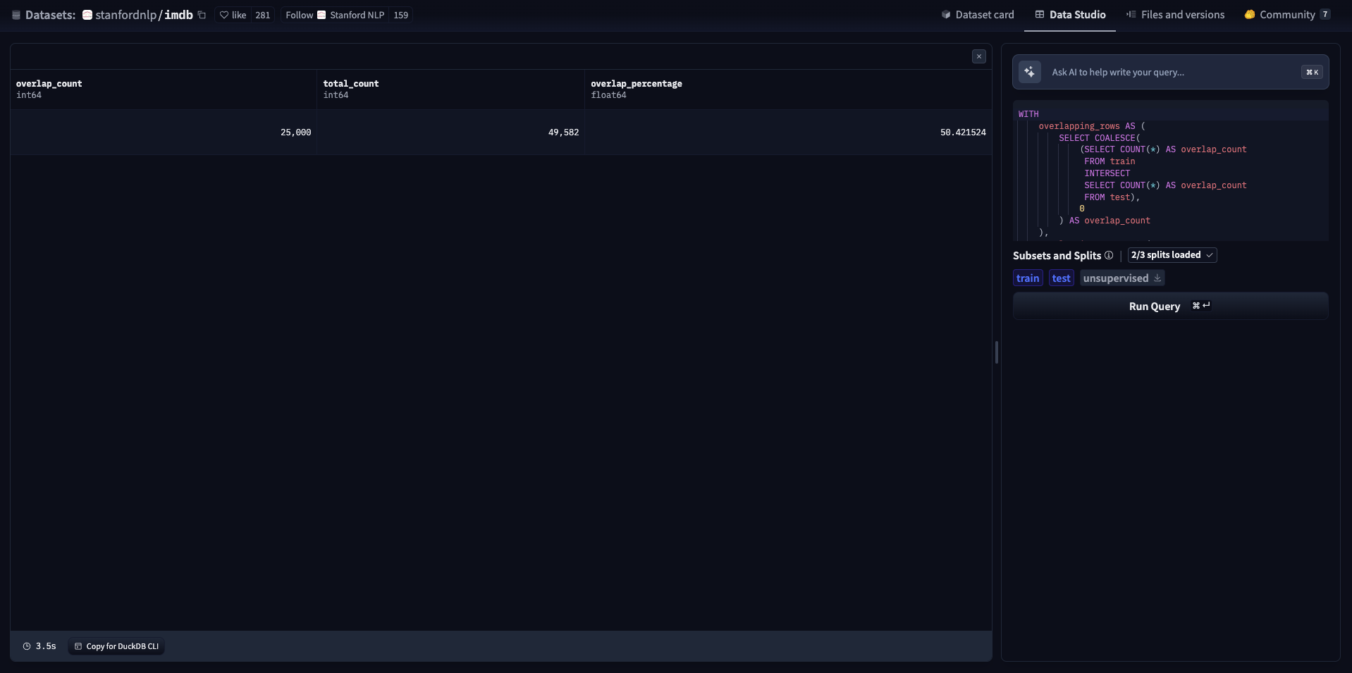 You can run SQL queries on the dataset in the browser using the SQL Console. The SQL Console is powered by DuckDB WASM and runs entirely in the browser. You can access the SQL Console from the Data Studio.