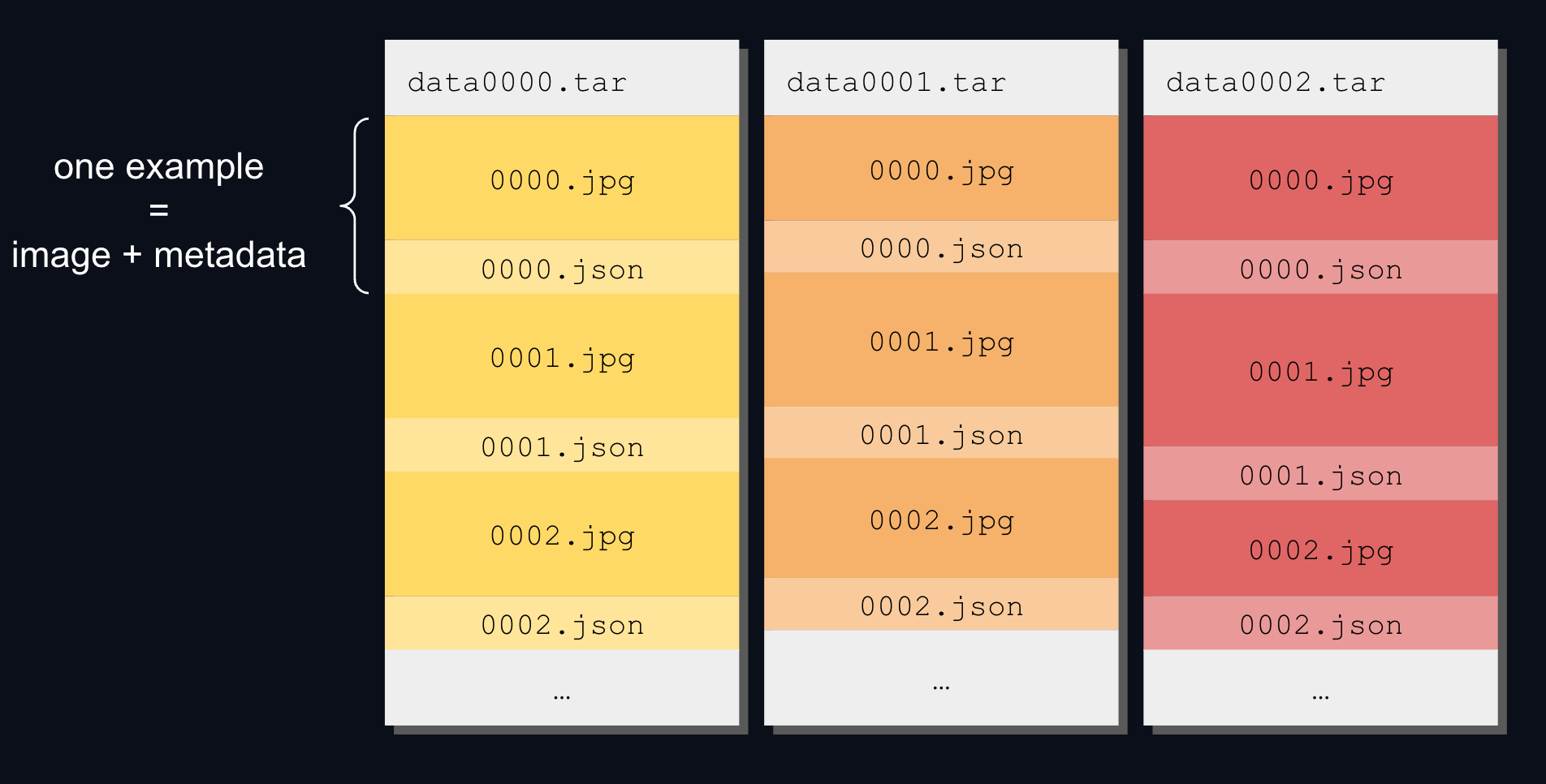 A large scale WebDataset is made of many files called shards, where each shard is a TAR archive. Each shard is often ~1GB but the full dataset can be multiple terabytes!
