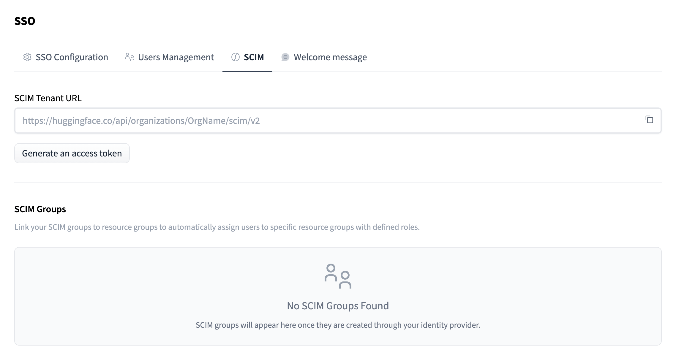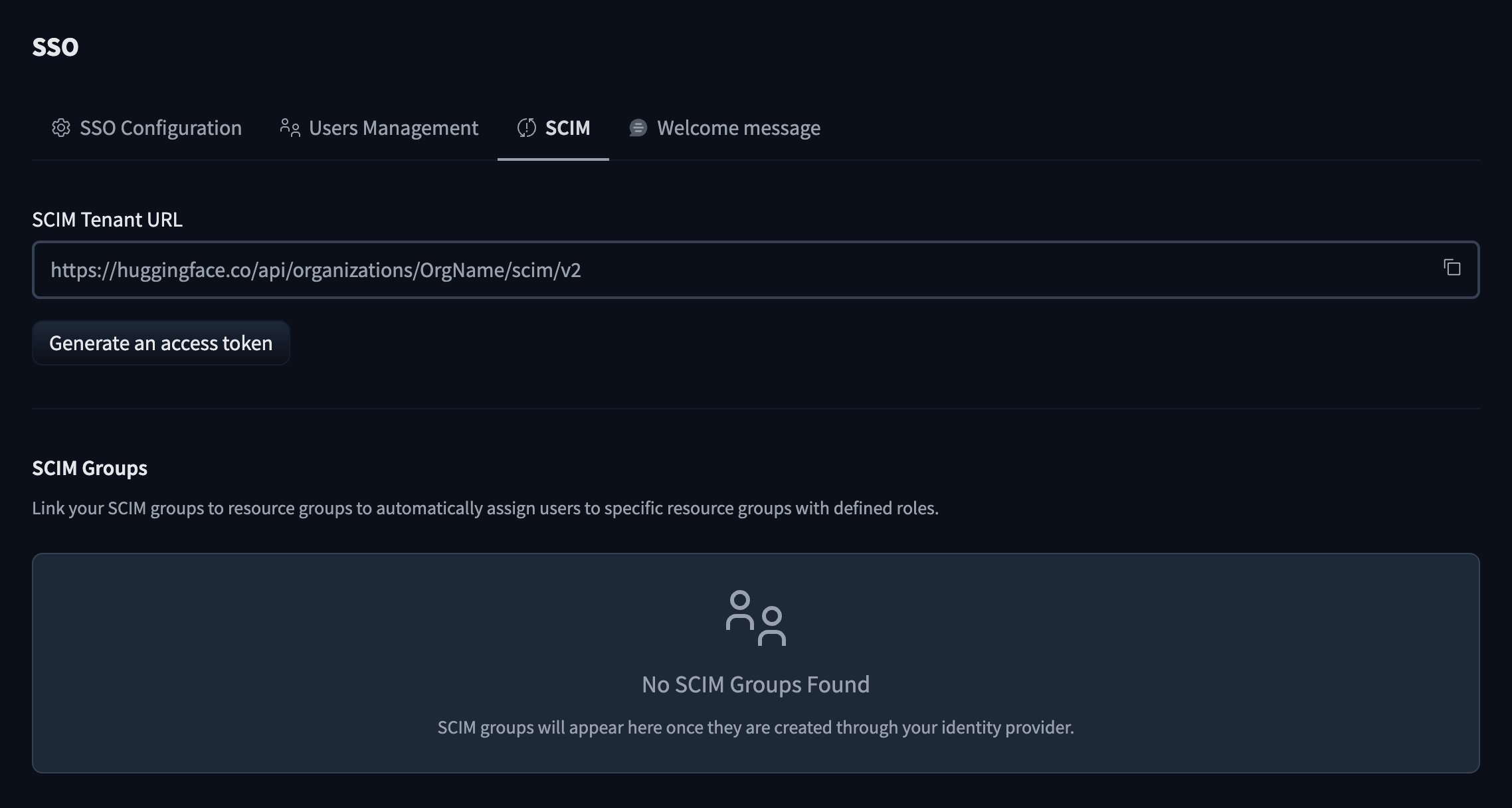 • Provision groups: Create groups in your Hugging Face organization based on groups in your IdP.