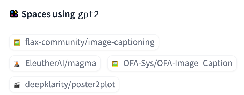 The Hugging Face Hub is also home to Spaces, which are interactive demos used to showcase models. If a model has any Spaces associated with it, you’ll find them linked on the model page like so: