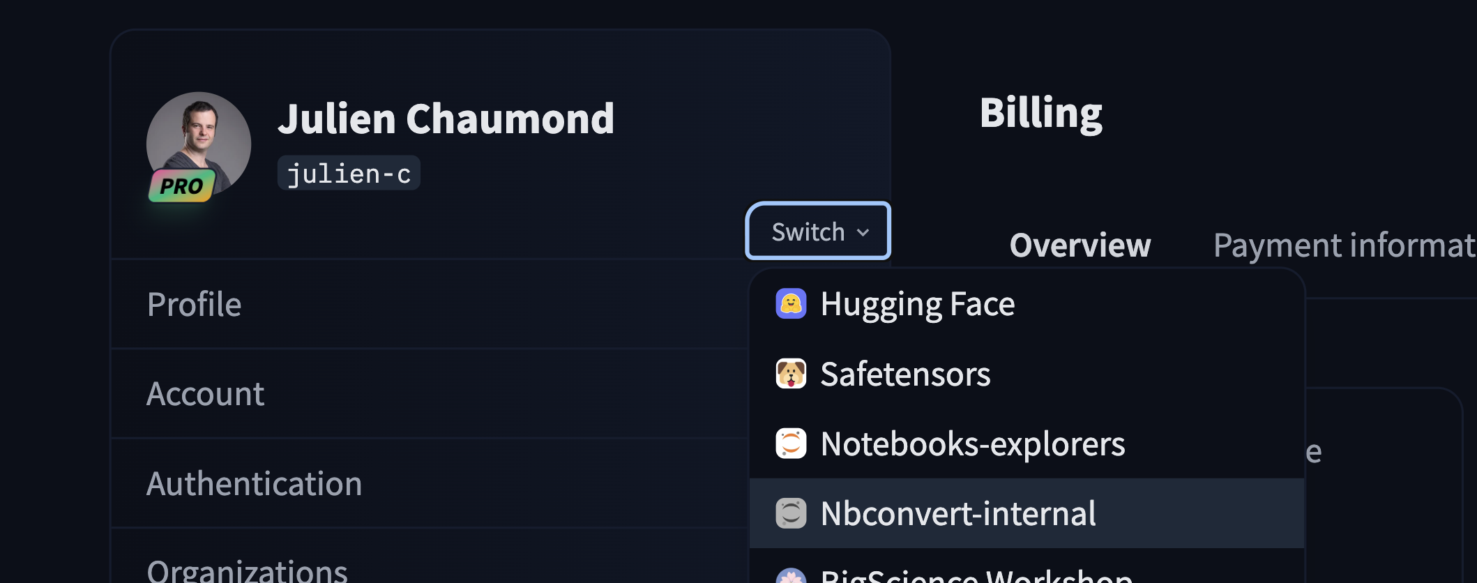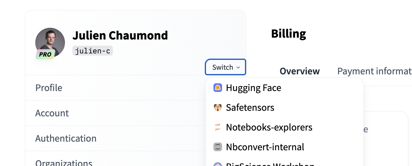 The Hugging Face Hub offers Organizations, which can be used to group accounts and manage datasets, models, and Spaces. The Hub also allows admins to set user roles to control access to repositories and manage their organization’s payment method and billing info.