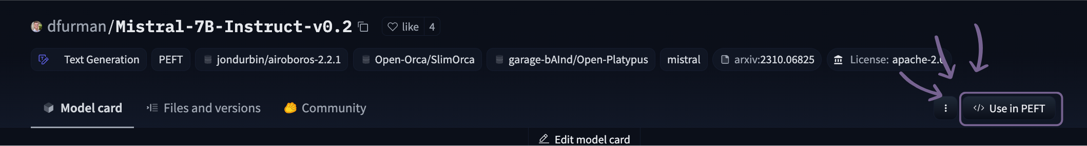 If you want to load a specific PEFT model, you can click Use in PEFT
