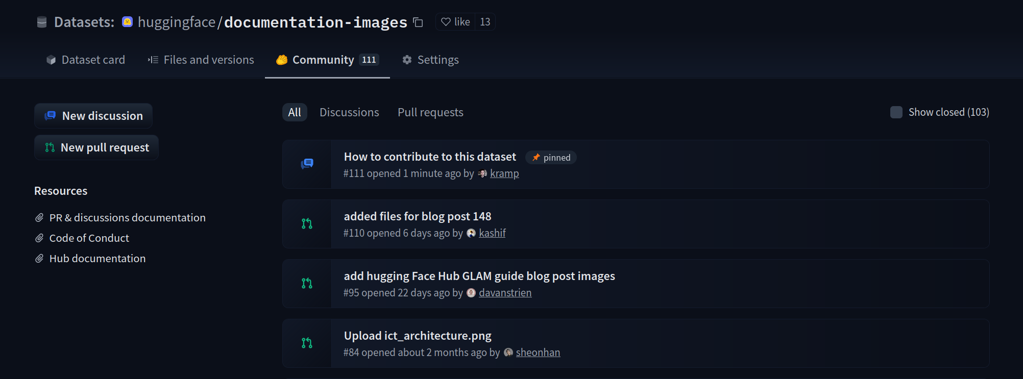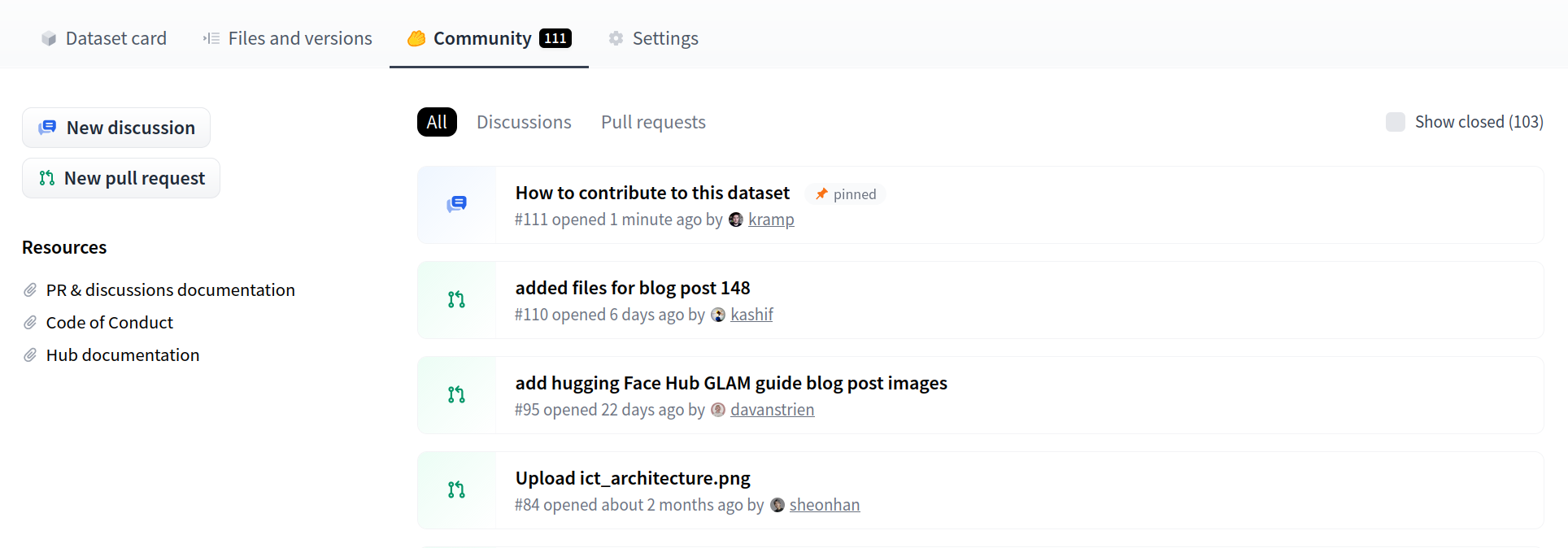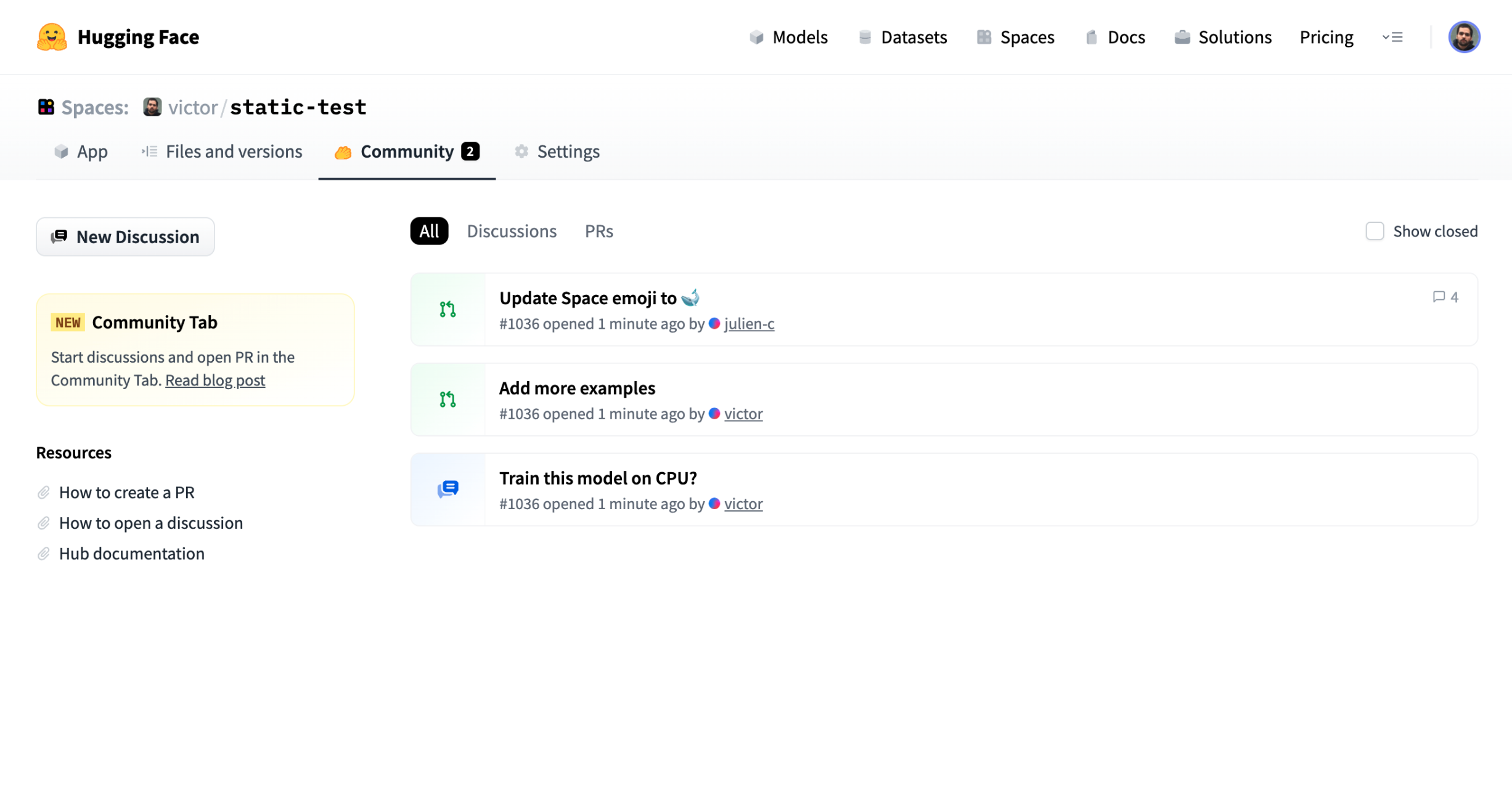 Hub Pull requests and Discussions allow users to do community contributions to repositories. Pull requests and discussions work the same for all the repo types.