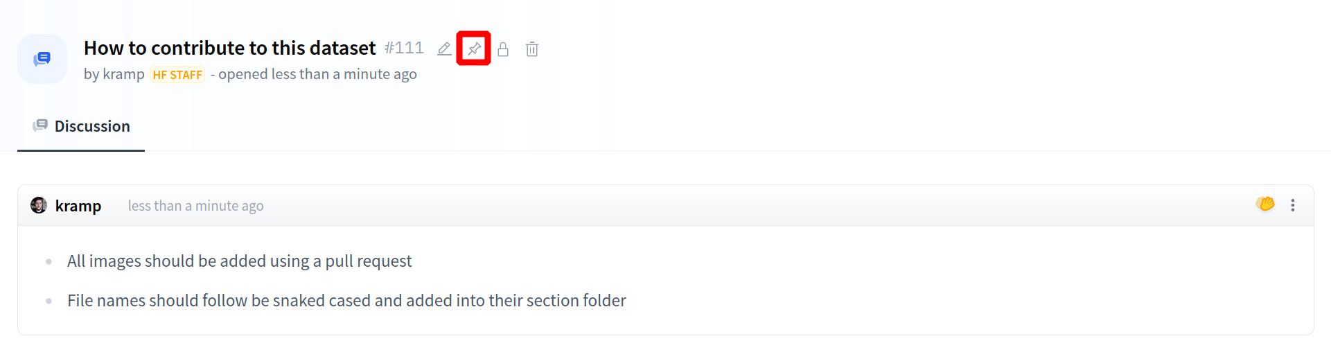 If you have write access to a repository, you can pin discussions and Pull Requests. Pinned discussions appear at the top of all the discussions.