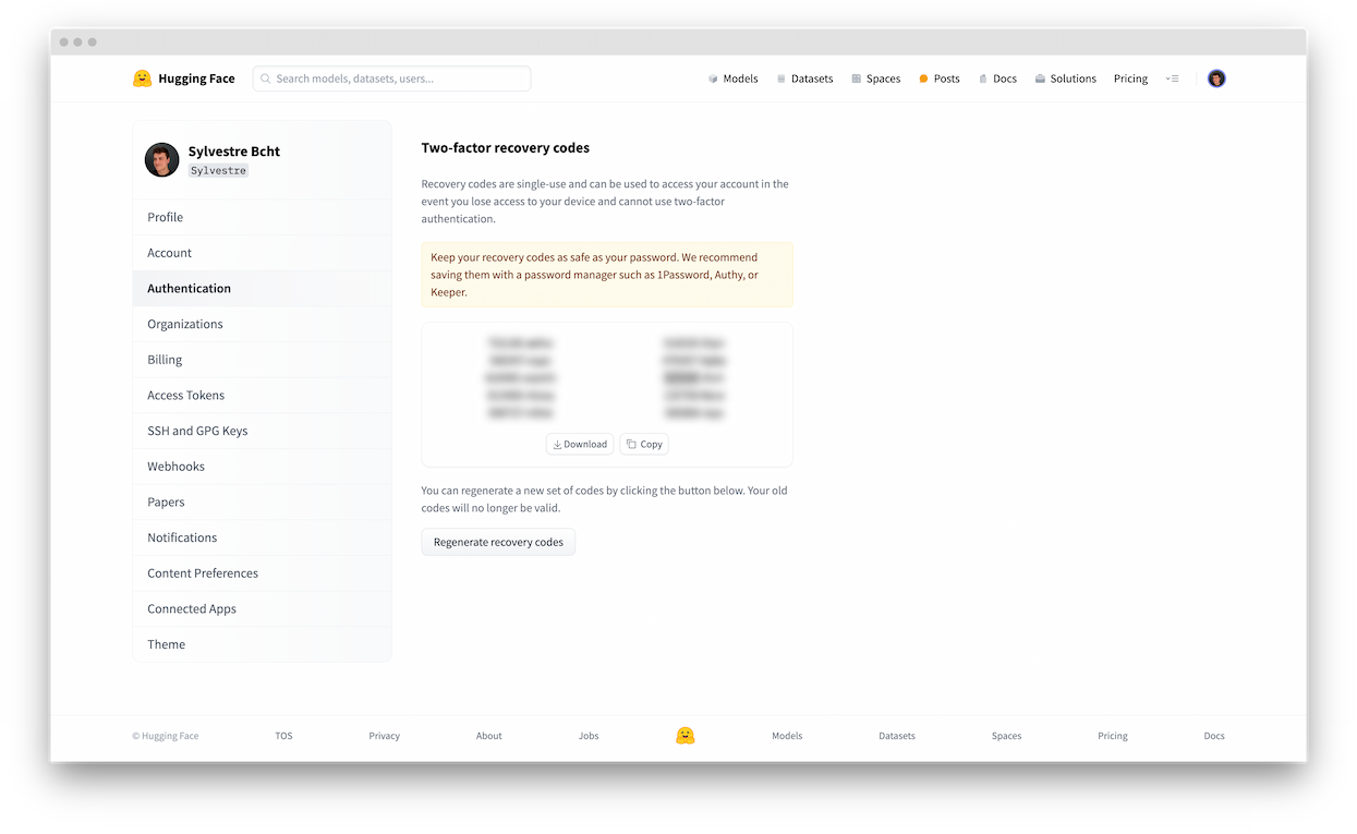 - You should copy and print the codes, or download them for storage in a safe place. If you choose to download them, the file is called huggingface-recovery-codes.txt