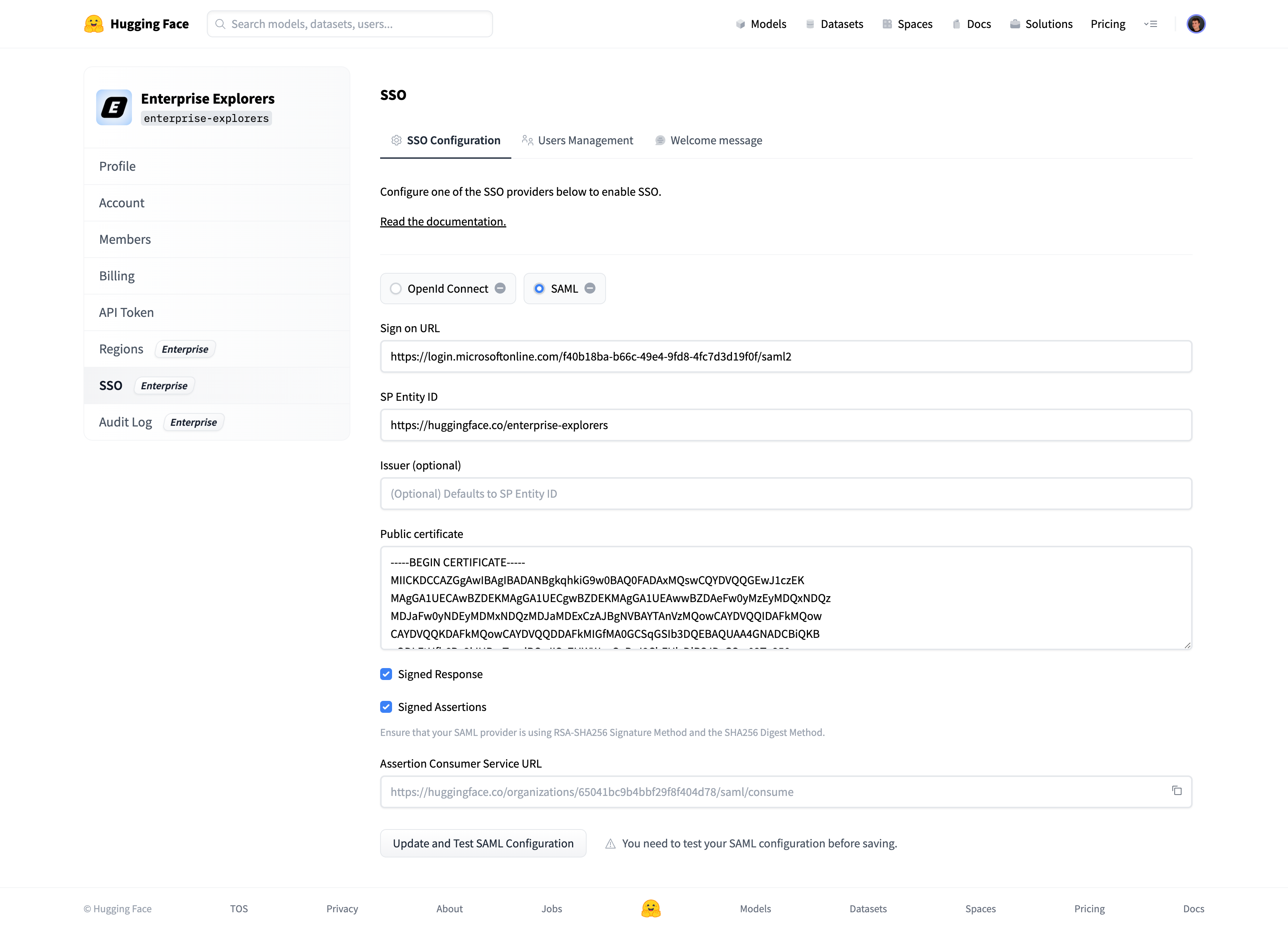 Copy the “SP Entity Id” from the organization’s settings on Hugging Face, and paste it in the “Identifier (Entity Id)” field on Azure (1).