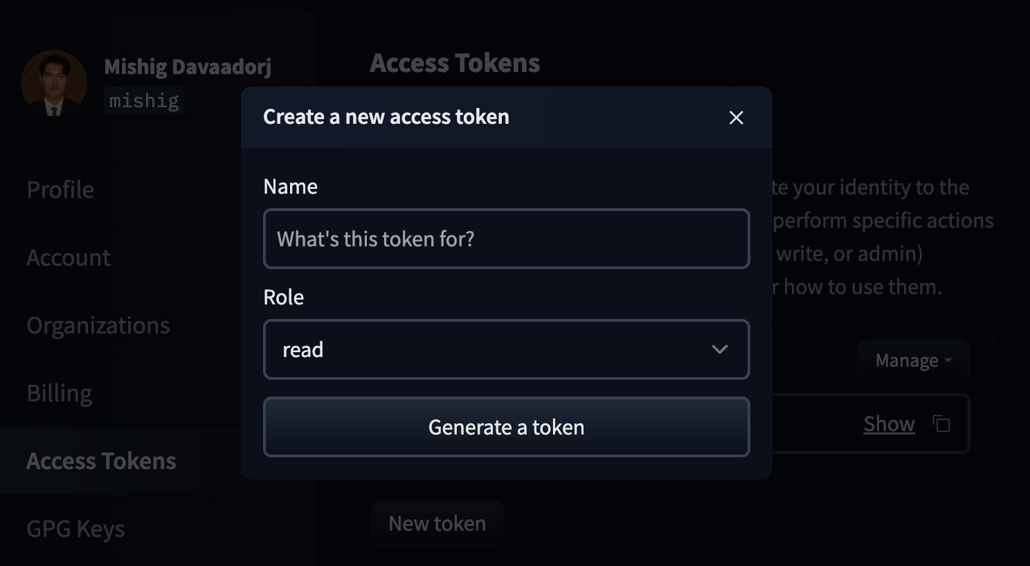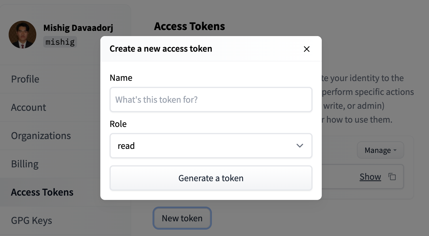 • fine-grained: tokens with this role can be used to provide fine-grained access to specific resources, such as a specific model or models in a specific organization. This type of token is useful in production environments, as you can use your own token without sharing access to all your resources.