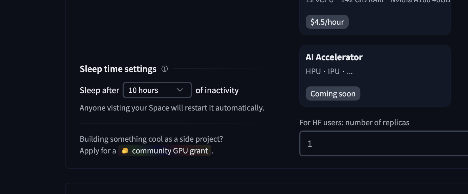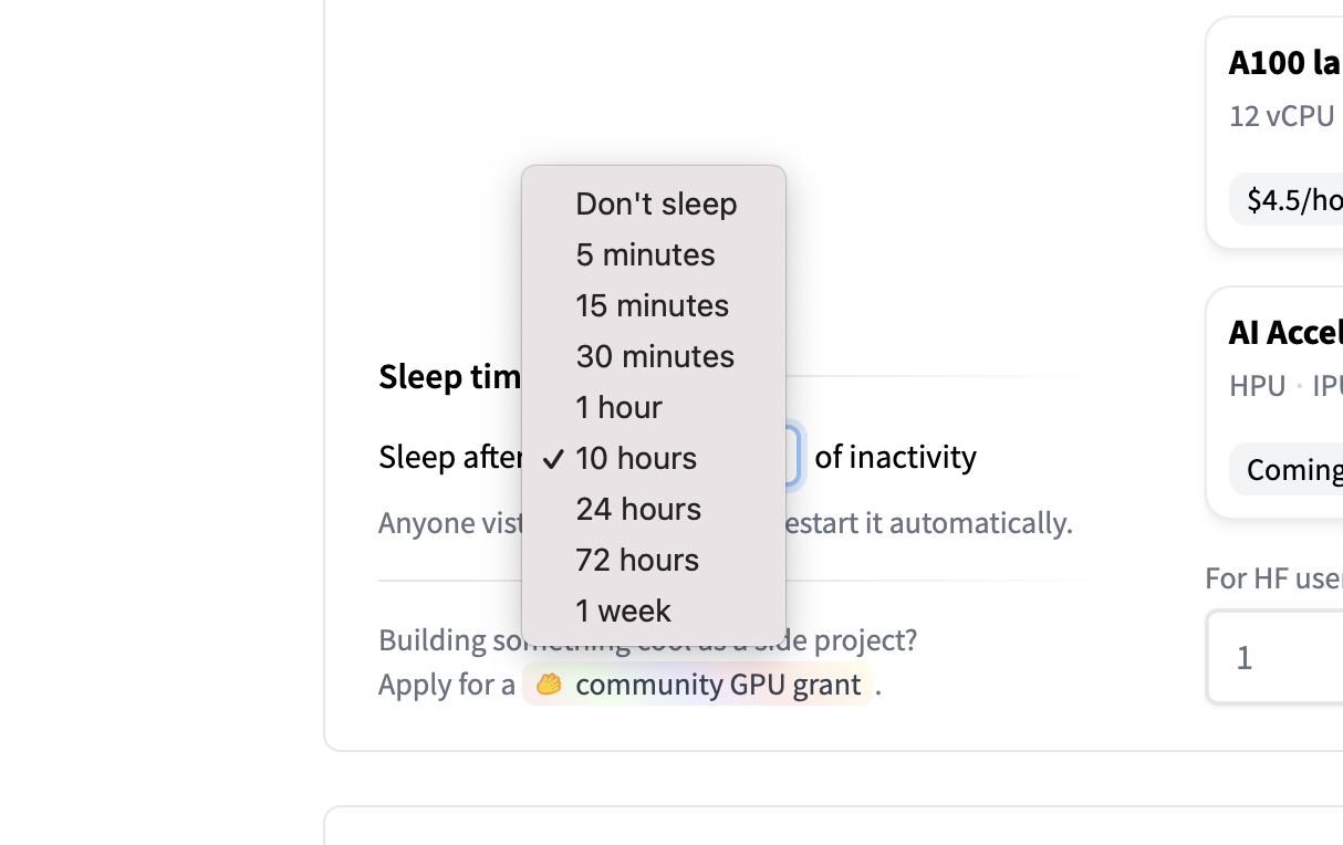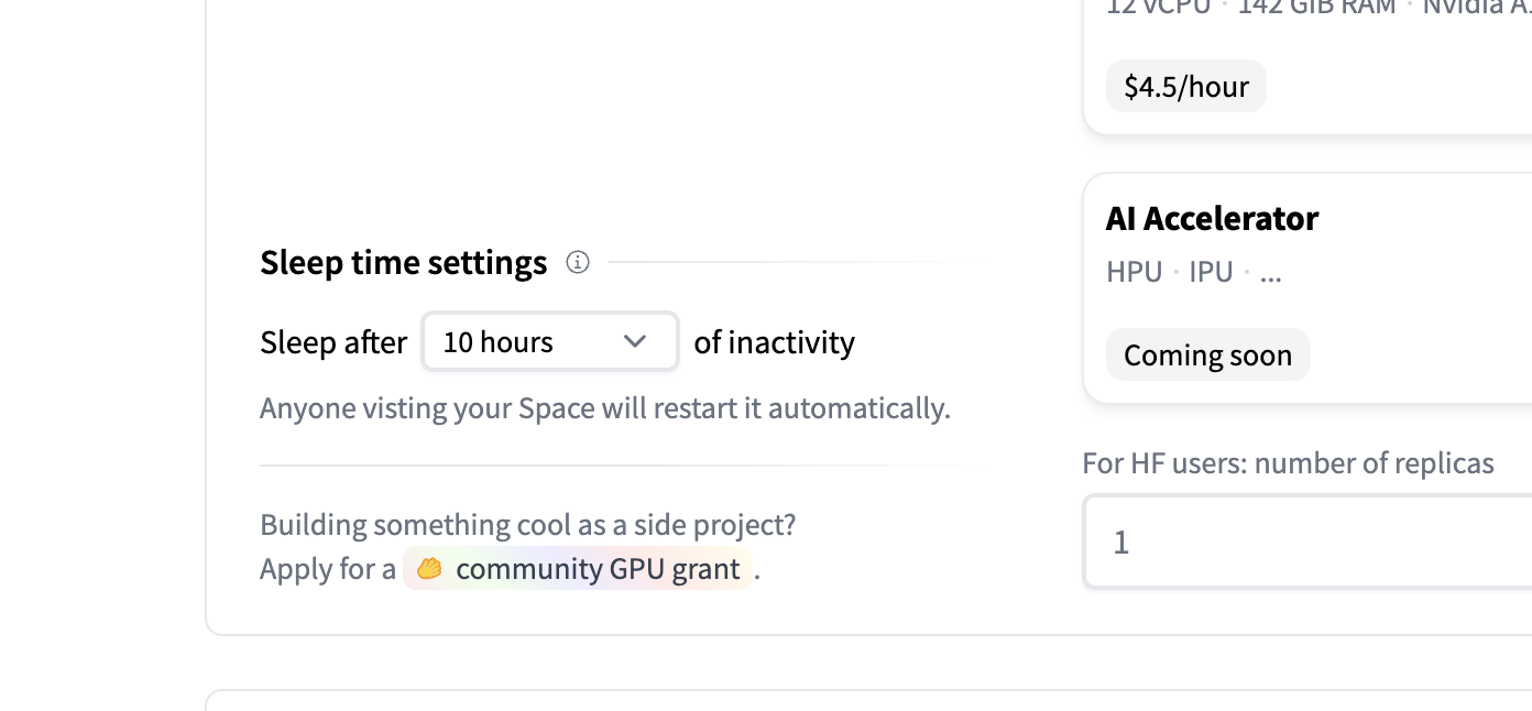 Do you have an awesome Space but need help covering the GPU hardware upgrade costs? We love helping out those with an innovative Space so please feel free to apply for a community GPU grant and see if yours makes the cut! This application can be found in your Space hardware repo settings in the lower left corner under “sleep time settings”: