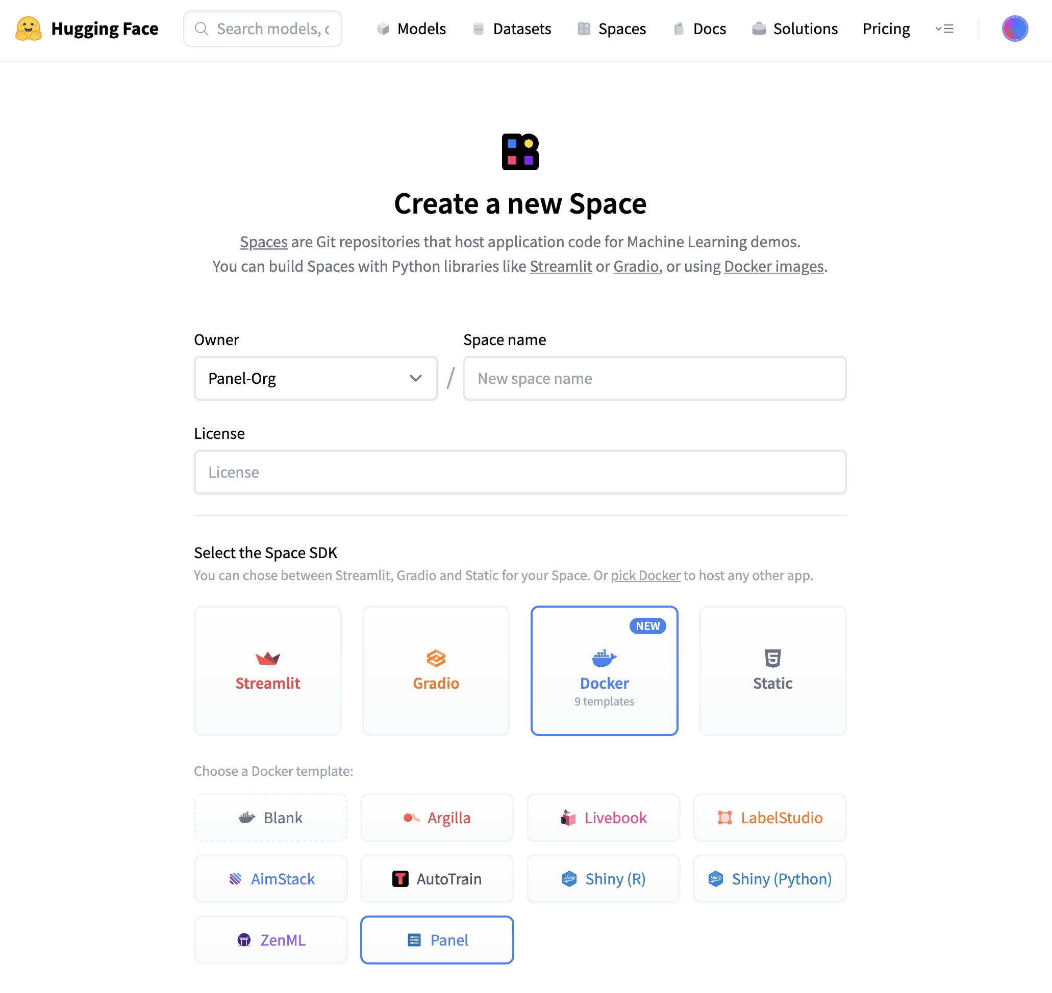 The Dockerfile contains a sequence of commands that Docker will execute to construct and launch an image as a container that your Panel app will run in. Typically, to serve a Panel app, we use the command panel serve app.py. In this specific file, we divide the command into a list of strings. Furthermore, we must define the address and port because Hugging Face will expect to serve your application on port 7860. Additionally, we need to specify the allow-websocket-origin flag to enable the connection to the server’s websocket.