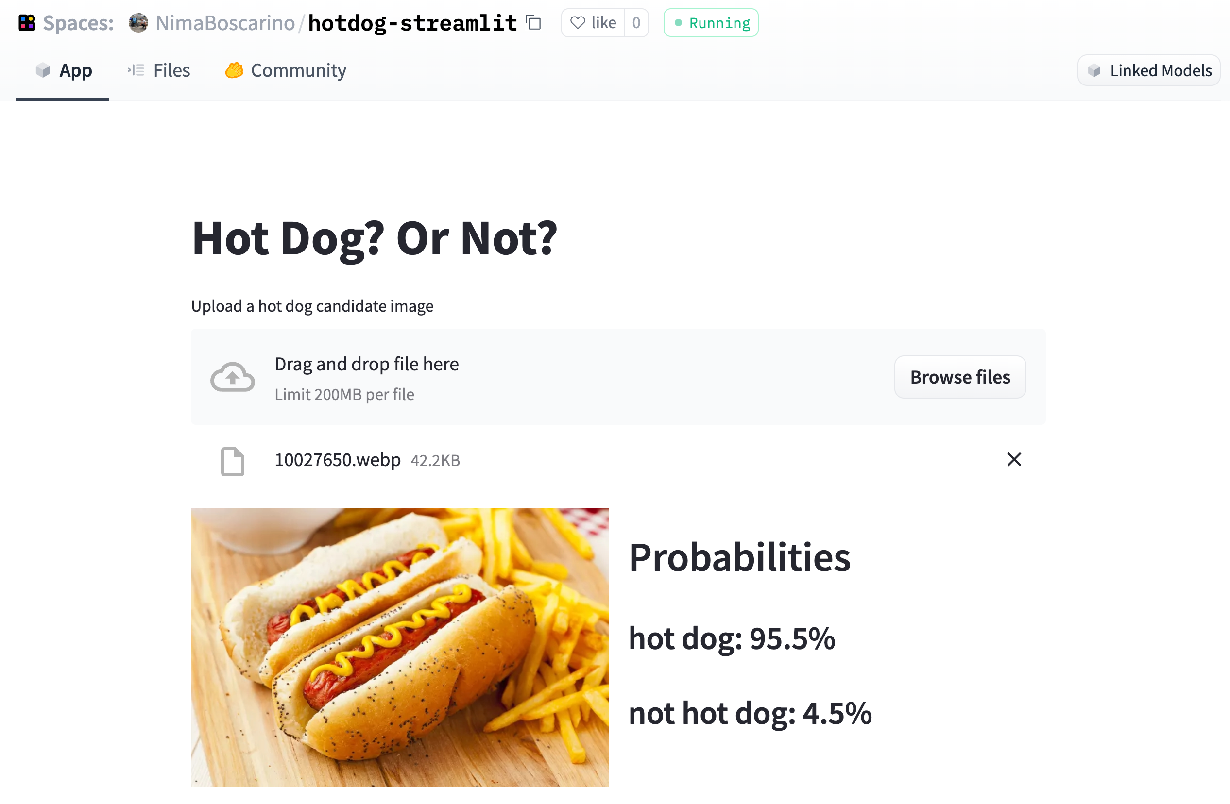 This Python script uses a 🤗 Transformers pipeline to load the julien-c/hotdog-not-hotdog model, which is used by the Streamlit interface. The Streamlit app will expect you to upload an image, which it’ll then classify as hot dog or not hot dog. Once you’ve saved the code to the app.py file, visit the App tab to see your app in action!