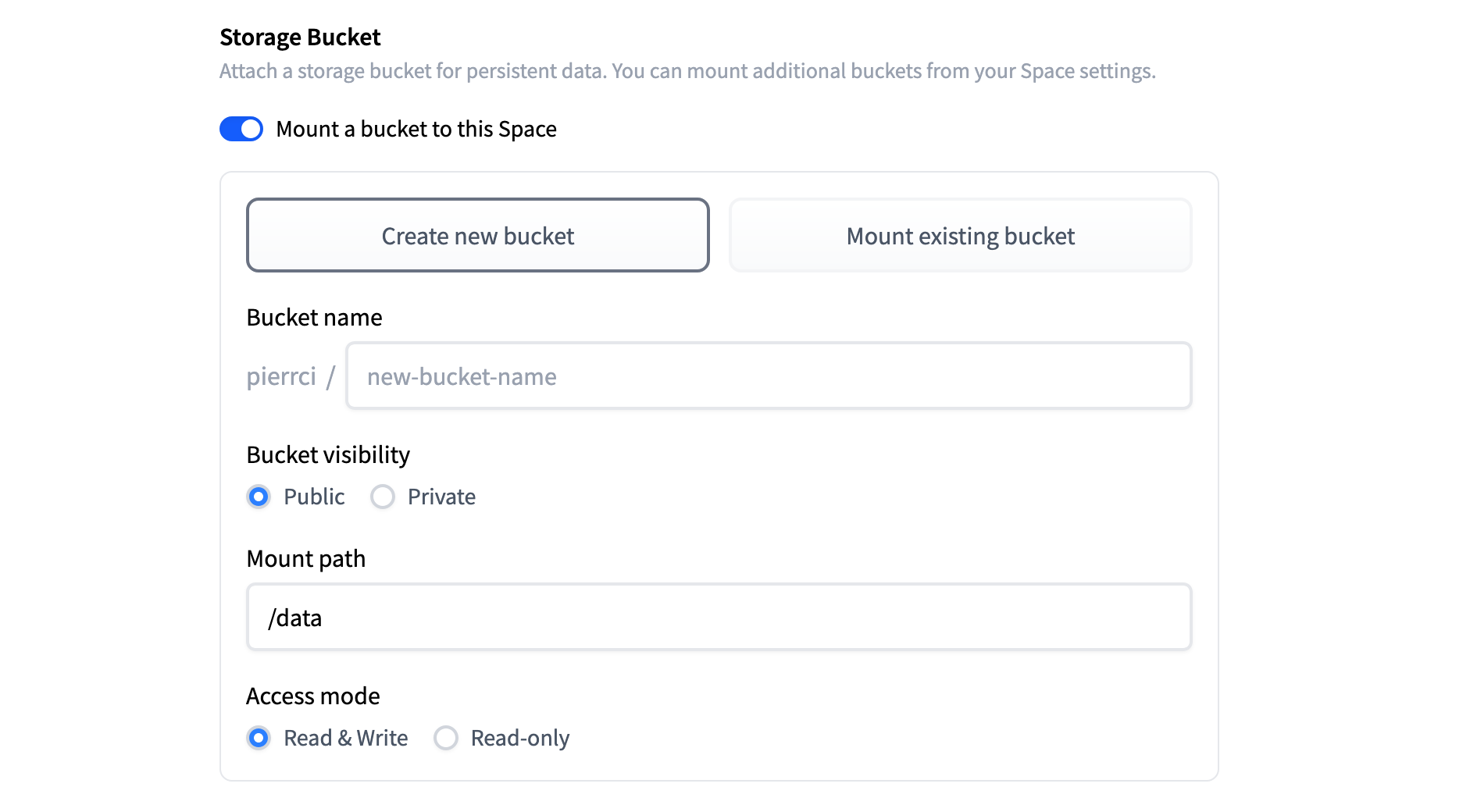Buckets can be attached when creating a Space, from the Space settings UI, or programmatically via the huggingface_hub Python API. They can be mounted read-write (the default) or read-only.