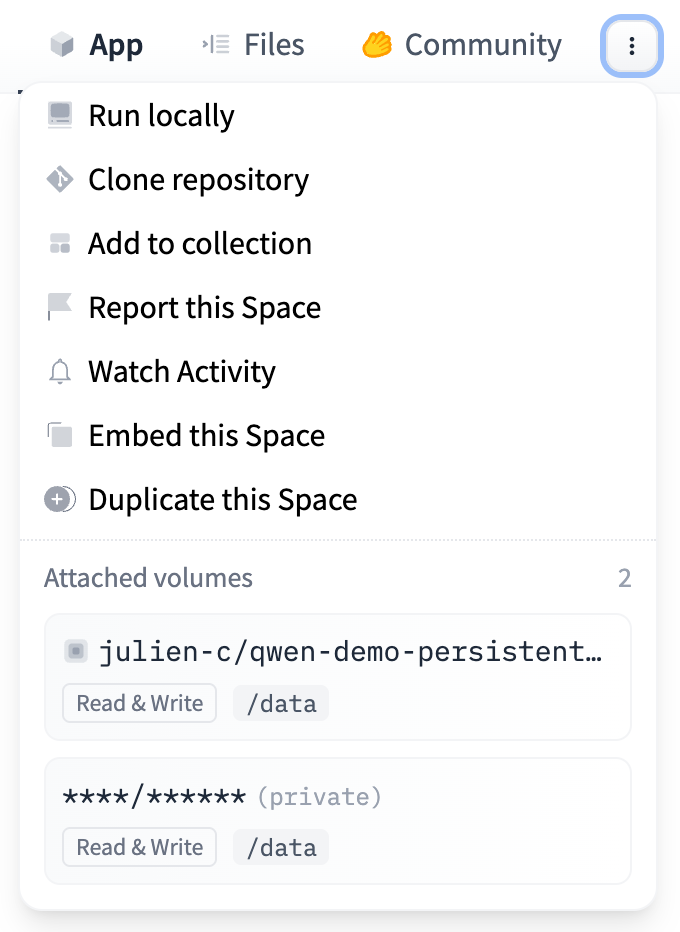 Once attached, repo volumes appear in the Space actions dropdown alongside buckets and can be viewed or unmounted from the UI.