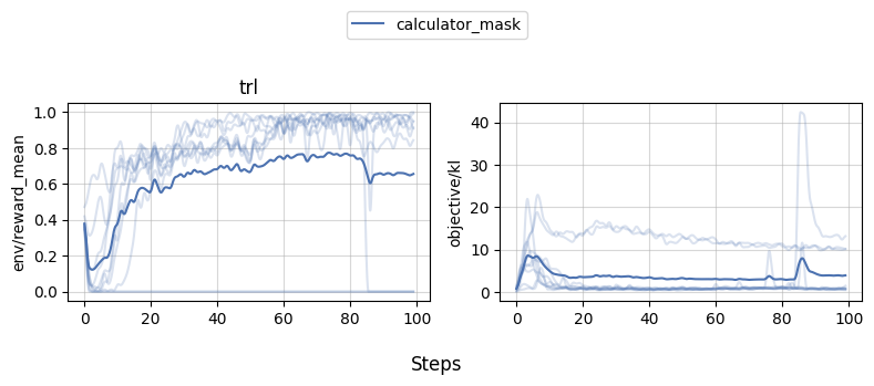 As we can see, while 1-2 experiments crashed for some reason, most of the runs obtained near perfect proficiency in the calculator task.