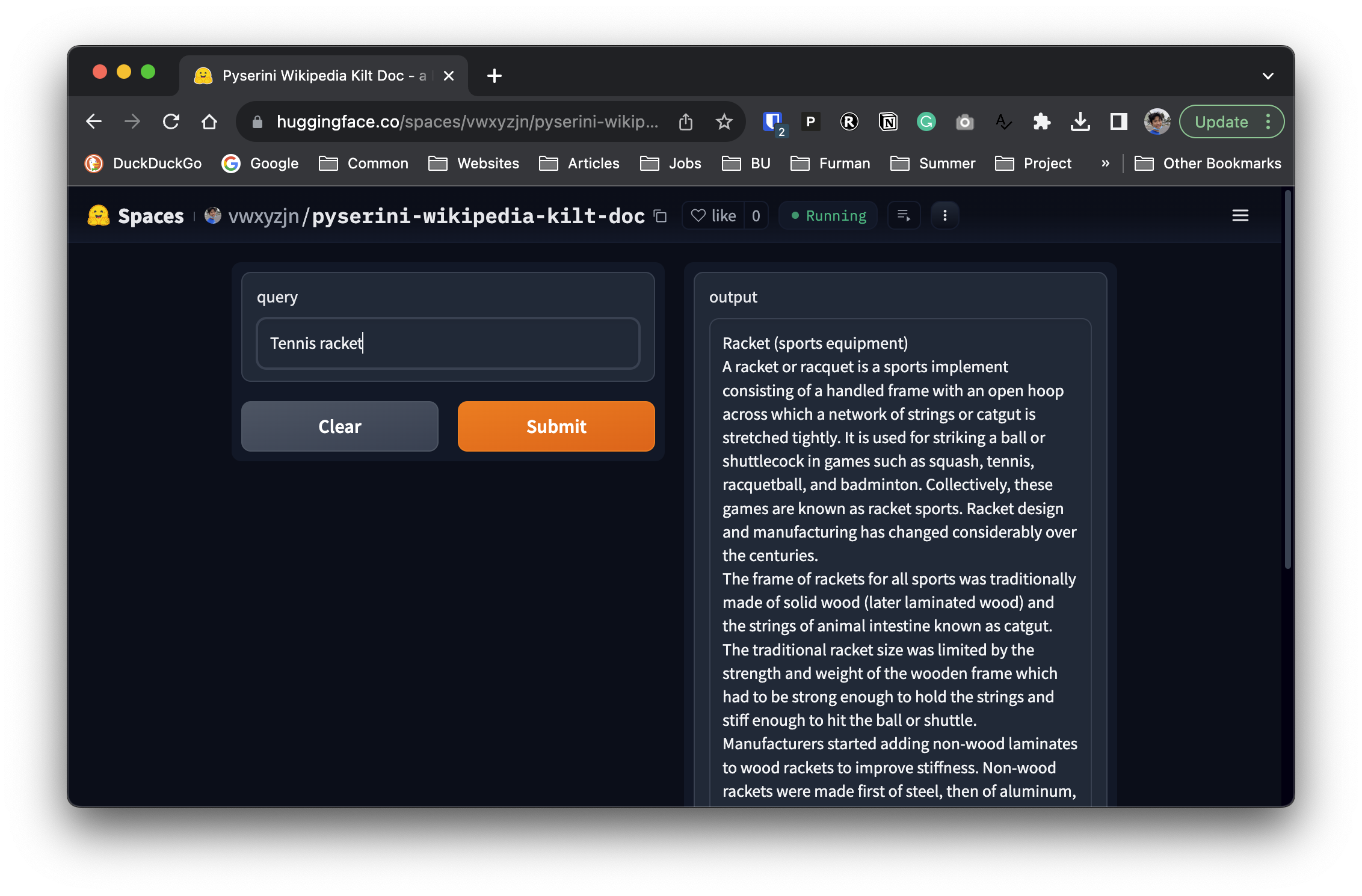 Since ToolFormer did not open source, we needed to first replicate the search index. It is mentioned in their paper that the authors built the search index using a BM25 retriever that indexes the Wikipedia dump from KILT