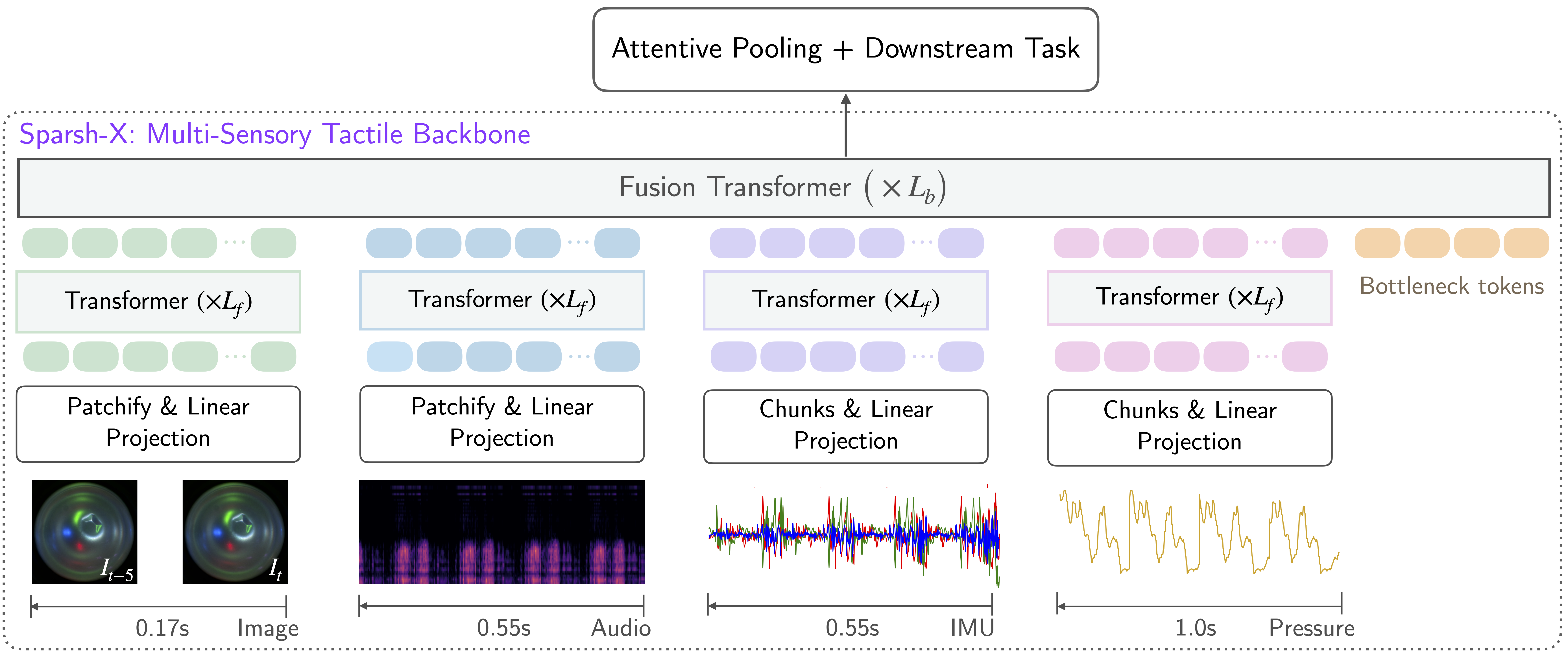 Sparsh-X is a transformer-based backbone where each input signal is first processed independently for $L_f$ layers through self-attention. Thereafter, we allow cross-modal information flow via attention bottlenecks. Specifically, we concatenate $B$ bottleneck fusion tokens to each modality’s embedding for the subsequent $Lb$ blocks. After each cross-modal update, the fusion tokens are averaged across modalities to promote information sharing. Intuitively, the bottleneck tokens act as multimodal summarizers, distilling and exchanging information between tactile modalities within each transformer block.