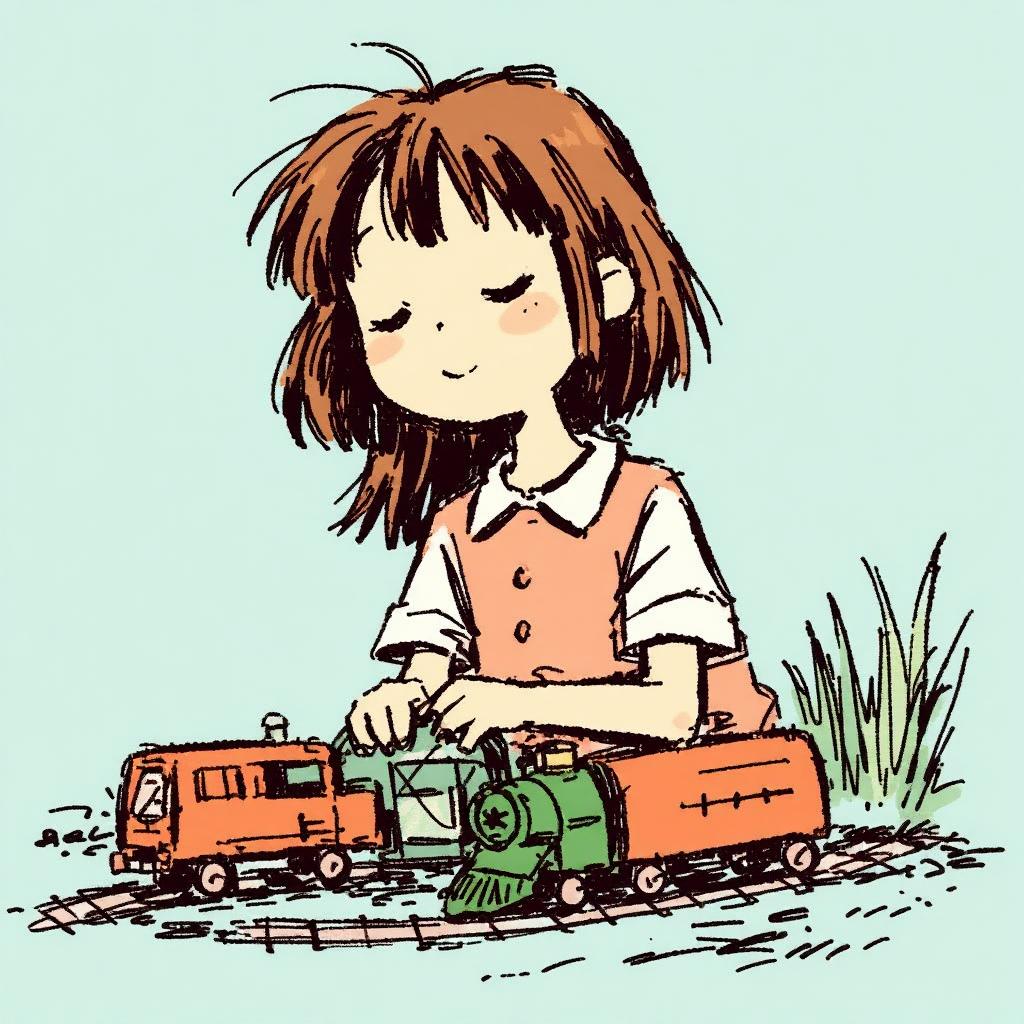 - Illustration card. A girl is playing with a miniature train set. in the style of TOK