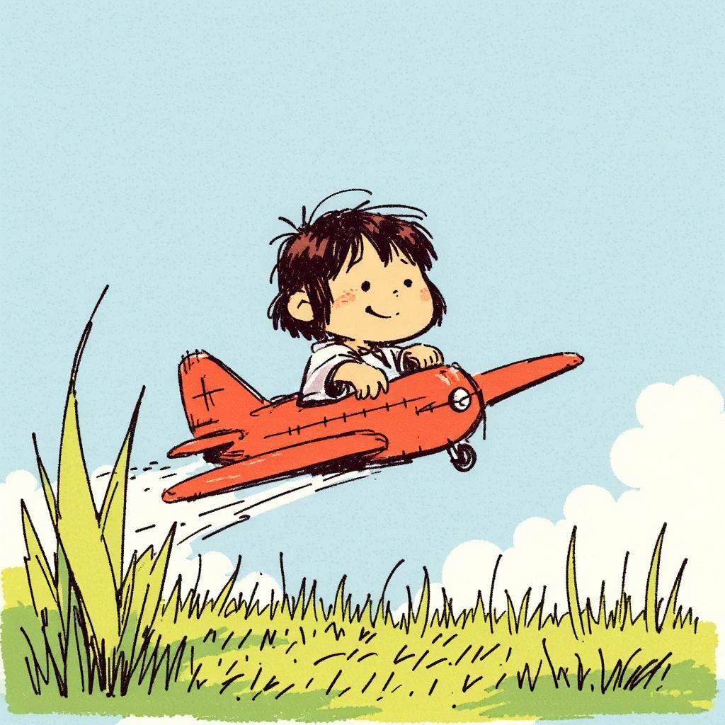 - Illustration card. a boy flying in an tiny airplane over the grass. in the style of TOK