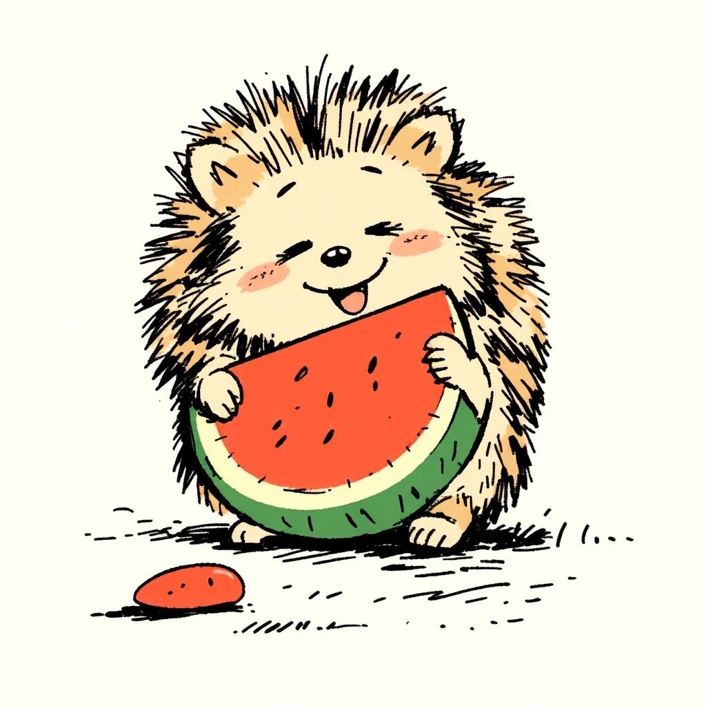 - A cute, happy hedgehog taking a bite from a piece of watermelon. in the style of TOK