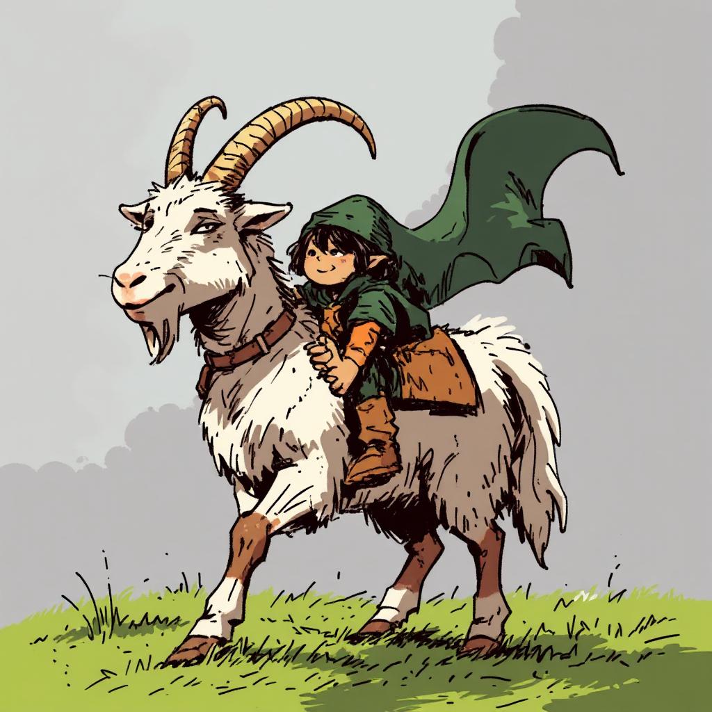 - A goat that serves as a mount for a dwarf boy warrior, with a saddle, large horns, and white fur.. in the style of TOK