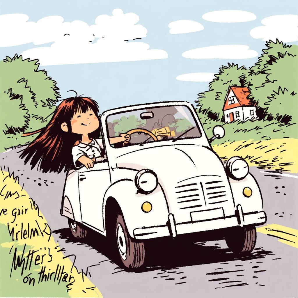 - Illustration of a girl drives a cute 2cv car over the road. in the style of TOK