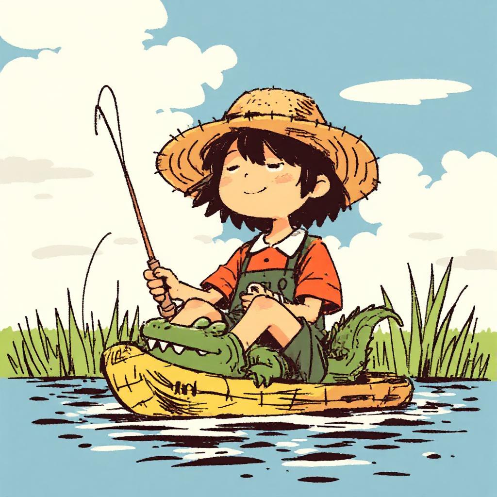 - a boy wearing a hat and holding a fishing rod, sitting in a boat with a crocodile on it, surrounded by water and grass, with a sky full of clouds in the background. in the style of TOK