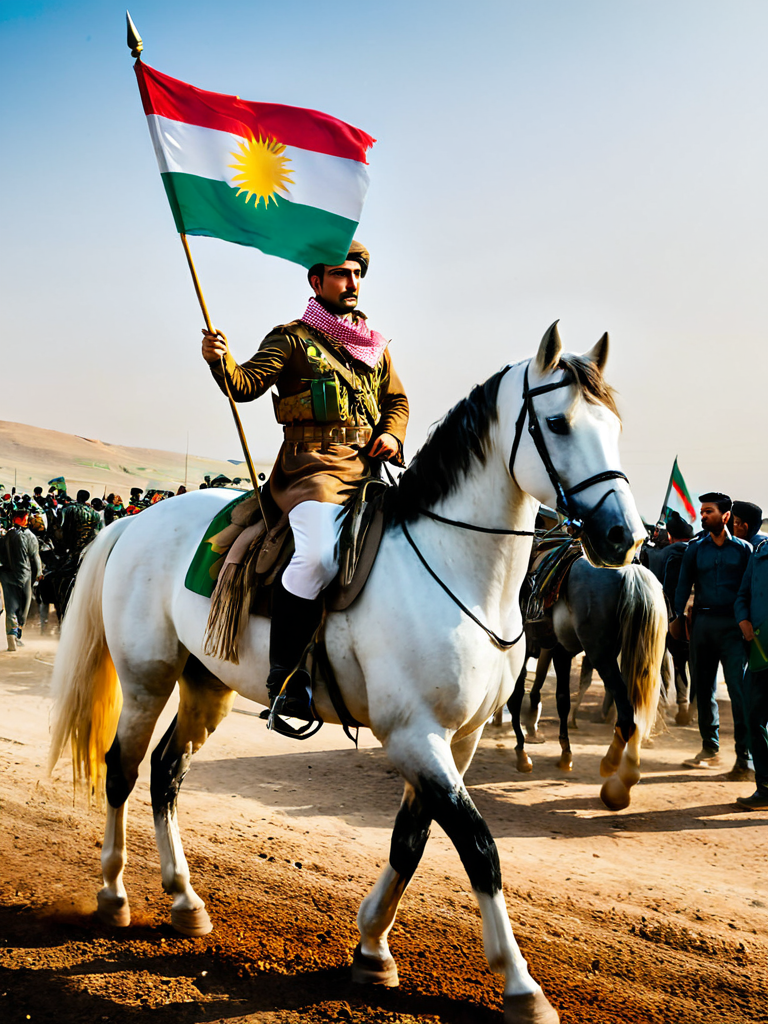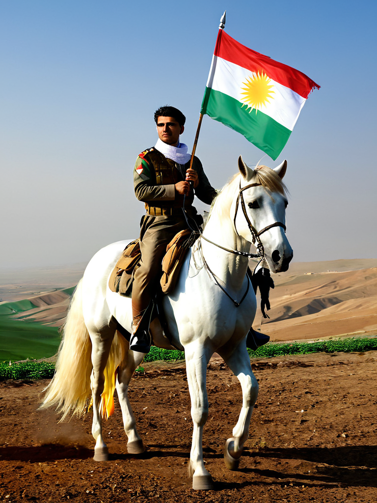 - a man on a horse in a war, hold a Kurdistan_Flag, <lora:Kurdistan_Flag:1>