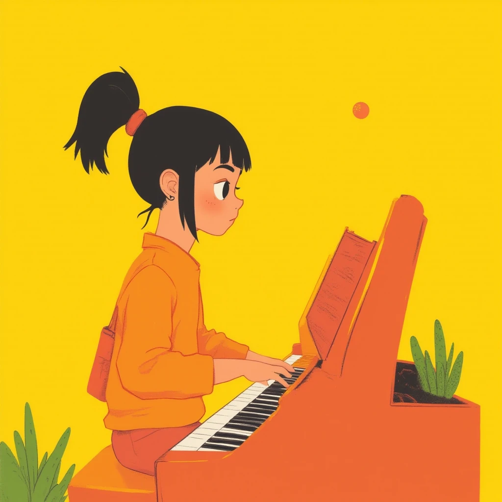 - a young girl playing piano, yellow background, LNTP illustration style