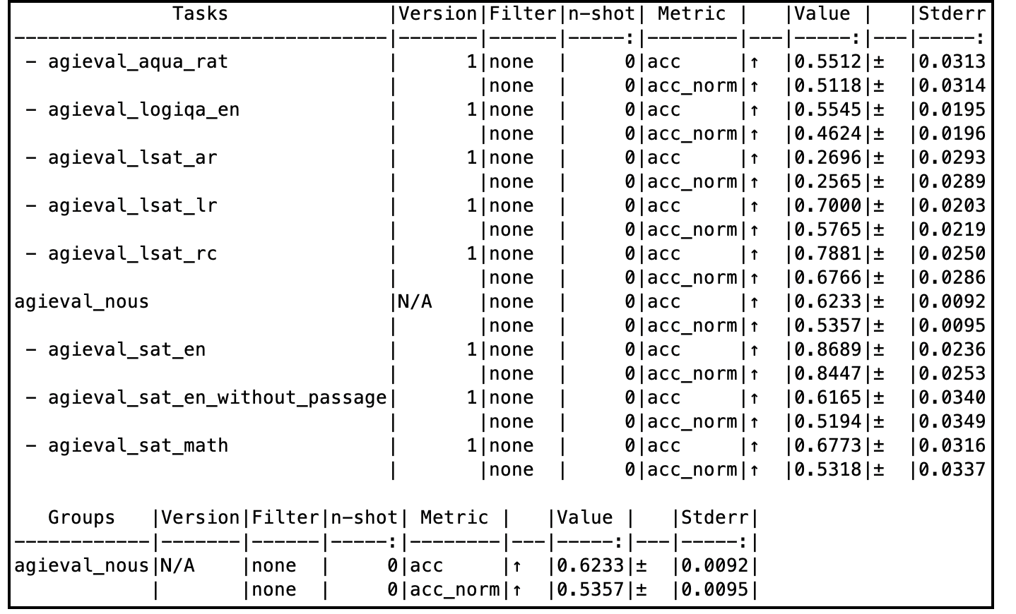 When evaluated on a subset of AGIEval (Nous), this model compares very well with the godfather GPT-4-0314 model as well.