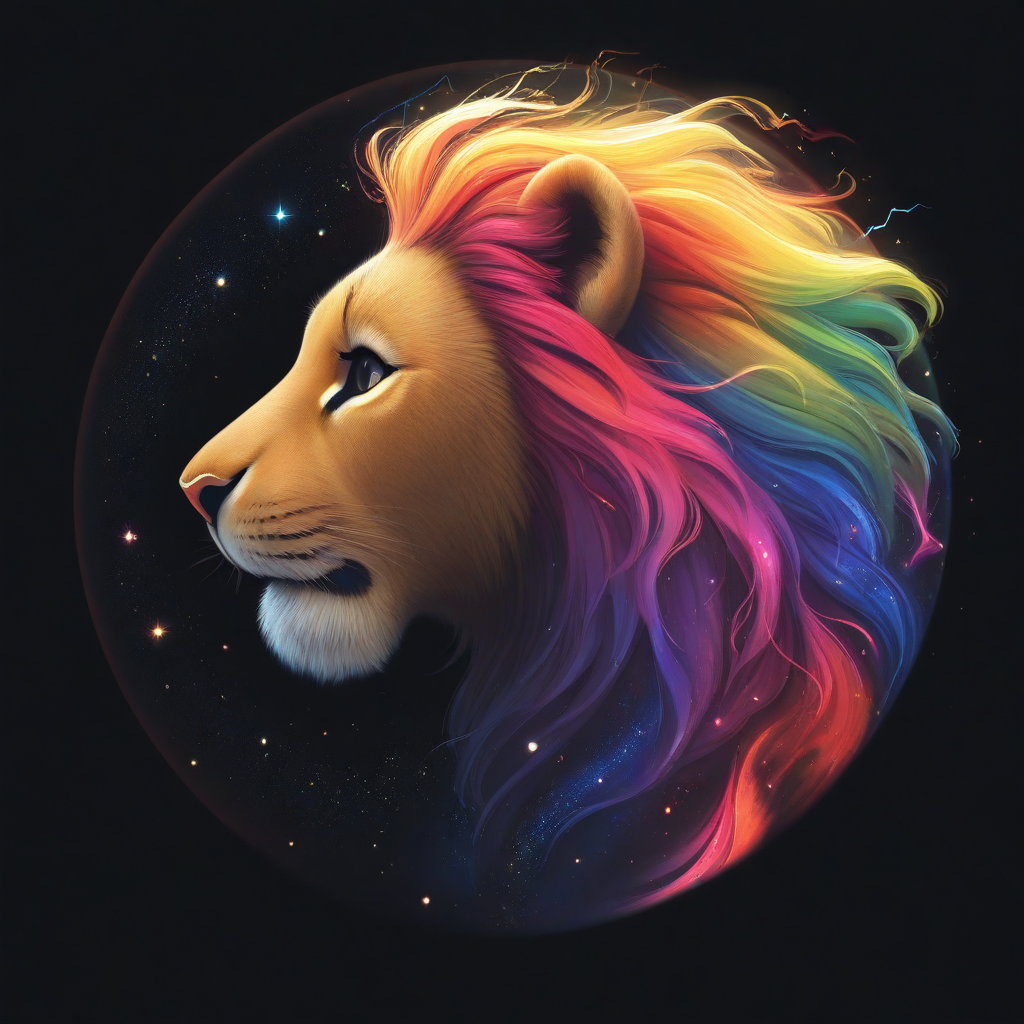 - masterpiece, best quality, amazing quality, very aesthetic, highres, absurdres, FROM SIDE, a lion, colorful mane, space, stars, black background, circle, electricity, concept art, professional illustratrion, hi res, newest, very awa