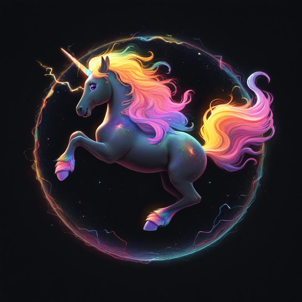 - masterpiece, best quality, amazing quality, very aesthetic, highres, absurdres, latent space, professional design, from side, unicorn, space, colorful mane, coloful hair, horn, electricity, CIRCLE, black background, concept art, professional illustratrion, hi res, newest, very awa
