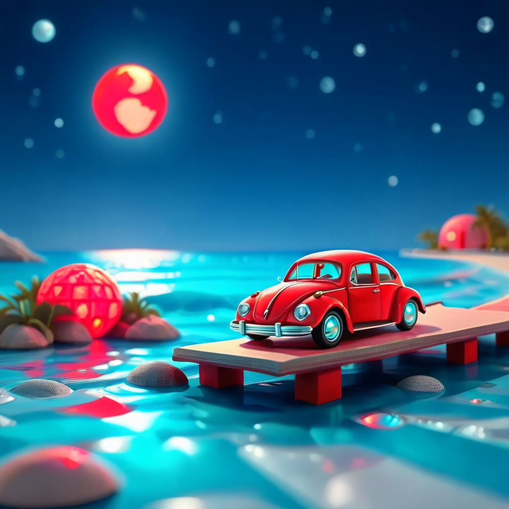 - miami beach hologram, adorable red fusca , slices of moon, surreal geometric cyan forest, star lit sky,chibi avatar,cute style