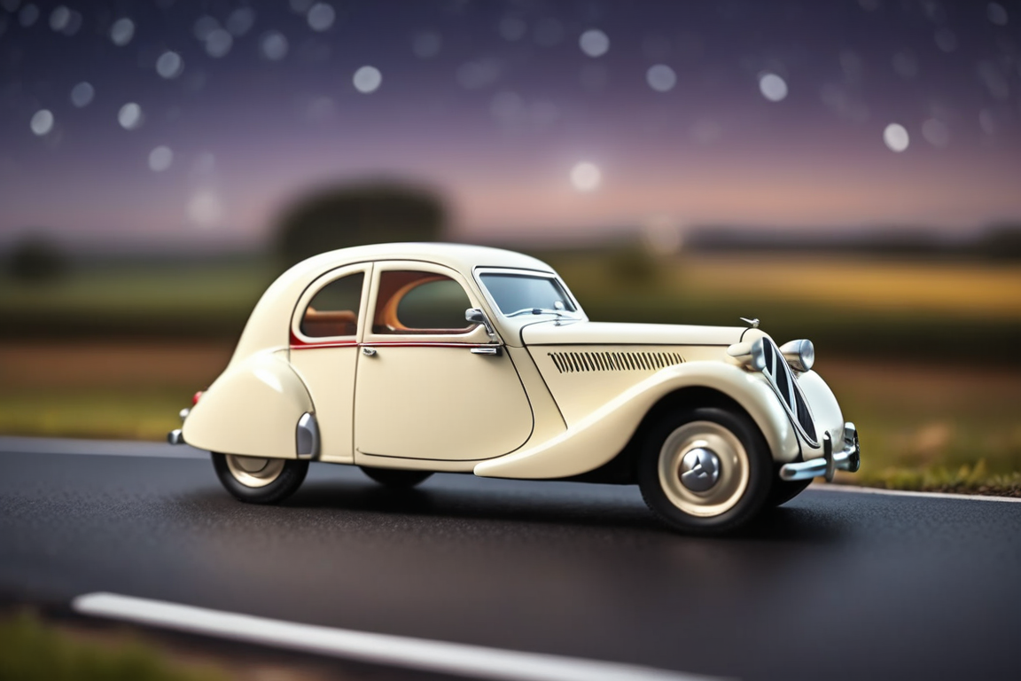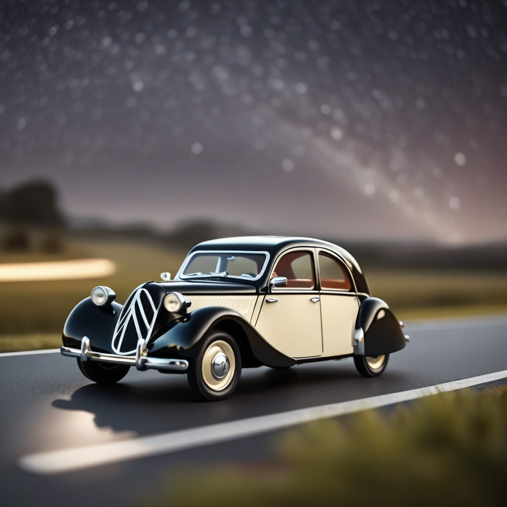 - Billy's Vintage Car, Citroën Traction Avant from years 1934 to 1957, Commonality type 3, Streamlined, groundbreaking design. Often seen in films. Sophisticated but has a rounded, appealing shape. glassy reflective road, glassy clean landscape, best bright night, star list sky, motion blur,