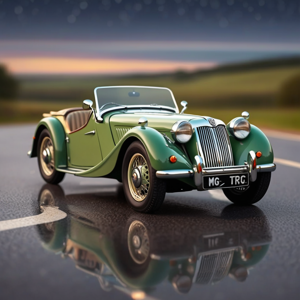 - Billy's Vintage Car, MG TC car, Classic British roadster. Small, sporty, and very charming. Popular post-war with returning soldiers.. glassy reflective road, glassy clean landscape, best bright night, aurora, motion blur, raining warm weather, sleek driving, high-octane, high-definition,