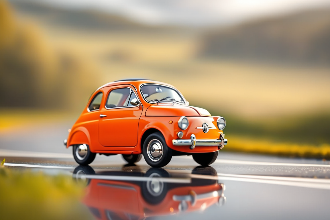 - Billy's Vintage Car, orange Fiat 500 "Topolino" , Tiny, adorable car, motion blur, glassy reflective road, glassy clean landscape, raining warm weather, sleek driving, high-octane, high-definition,