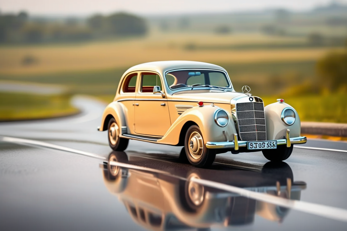 - Billy's Vintage Car, classy Mercedes-Benz 170 car, motion blur, glassy reflective road, glassy clean landscape, raining warm weather, sleek driving, high-octane, high-definition,