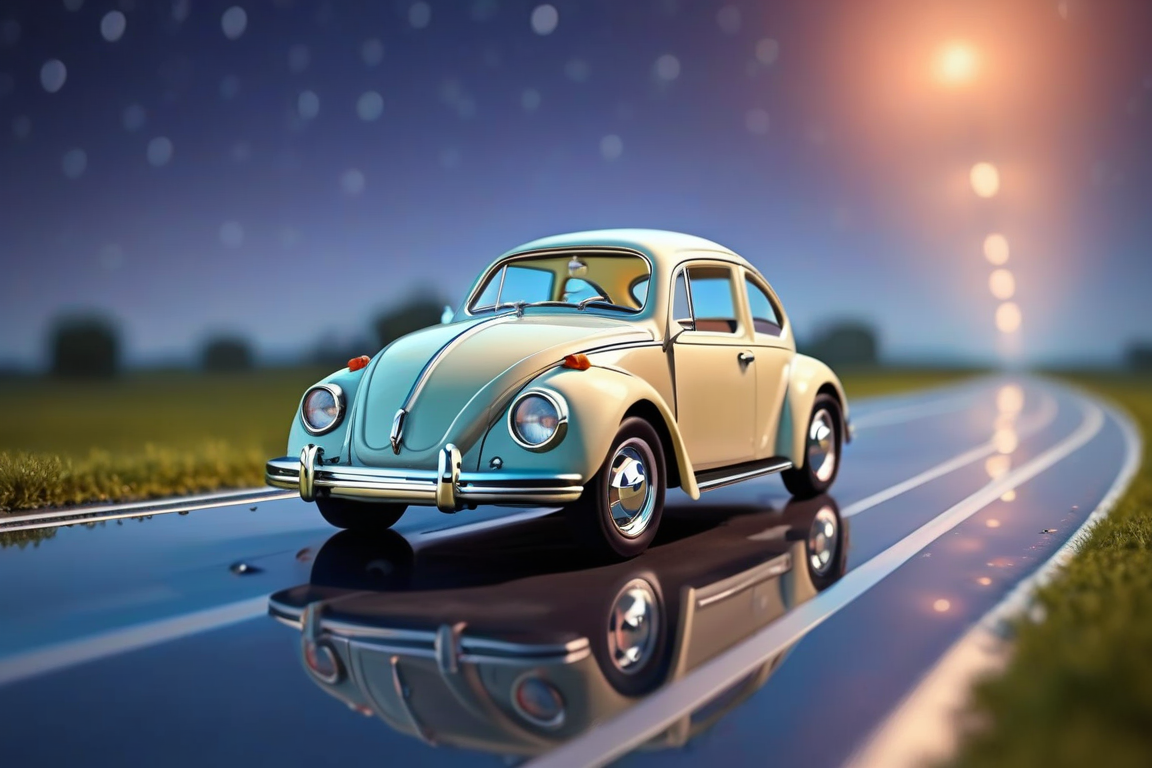 - Billy's Vintage Car, original early design VW Beetle (Fusca) . glassy reflective road, glassy clean landscape, best bright night, aurora, motion blur, raining warm weather, sleek driving, high-octane, high-definition,