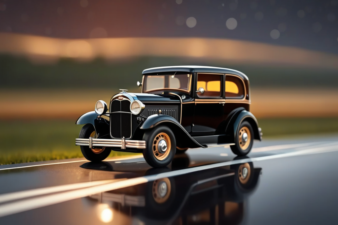 - Billy's Vintage Car, Billy's Vintage Car, classy Ford Model A with wooden decoration, car body in jetblack. glassy reflective road, glassy clean landscape, best bright night, aurora, motion blur, raining warm weather, sleek driving, high-octane, high-definition,
